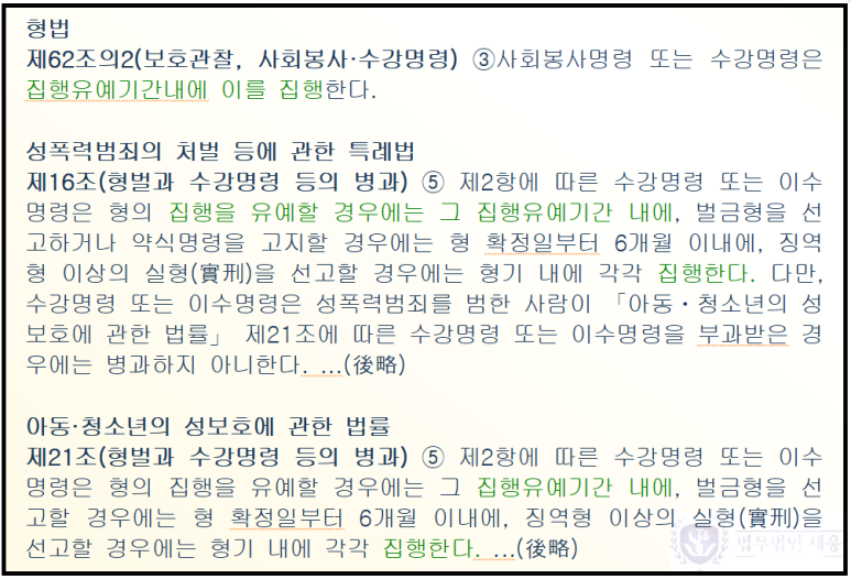 형법 제62조의2 제3항은 사회봉사명령 또는 수강명령은 집행유예 기간 내에 집행하도록 되어 있고 성폭력범죄의 처벌 등에 관한 특례법 제16조 제5항, 아동·청소년의 성보호에 관한 법률 제21조 제5항에서도 집행유예에 병과 되는 수강명령은 집행유예 기간 내에 집행하도록 정하고 있습니다.