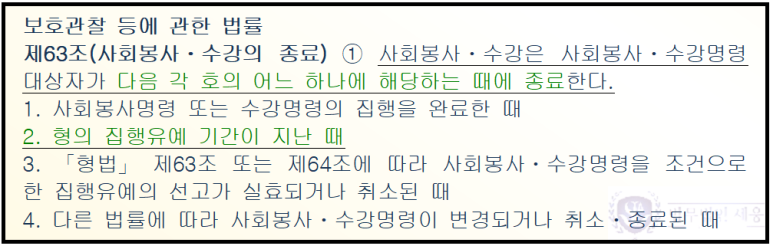 그리고 보호관찰 등에 관한 법률에서는 사회봉사와 수강의 종료 사유로서 '형의 집행유예 기간이 지난 때'를 들고 있습니다.