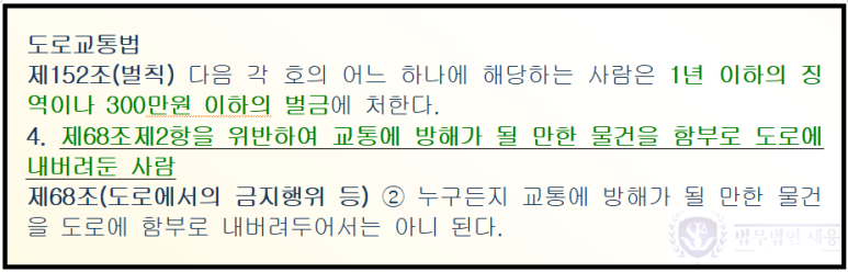 그리고 무엇보다 중요한 것은 이와 같이 도로 위에 물건을 함부로 두는 것은 사고가 나지 않아도 형사처벌 대상이 된다는 점입니다. 도로교통법 제152조 제4호, 제68조 제2항은 교통에 방해가 될 만한 물건을 도로에 함부로 두면 안 된다고 규정하고 있고 이를 위반하는 경우 1년 이하의 징역이나 300만 원 이하의 벌금에 처하도록 정하고 있습니다.