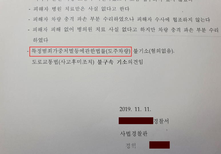간혹 경찰관들이 수사보고 등을 작성할 때 죄명이 바뀐 몇 년이 지난 죄명을 그대로 사용하는 경우가 있는데요, 이는 죄명이 어떻게 정해지는 것인지 알지 못하고 과거에 자신이 업무를 하면서 알게 된 것을 그대로 사용하기 때문이 아닌가 싶습니다. 대표적인 것이 흔히 뺑소니라고 불리는 ‘특정범죄가중처벌등에관한법률위반(도주치상)’입니다. 과거에는 피해자가 상해를 입었는지 사망했는지 구분하지 않고 ‘특정범죄가중처벌등에관한법률위반(도주차량)’이라고 했었는데 아직도 그렇게 쓰고 있는 것이지요.