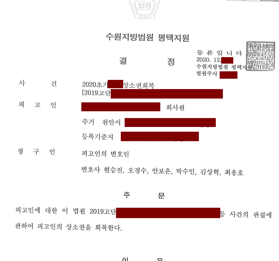 한편 상소권이 회복되는 결정이 있게 되면 재판은 확정 전의 상태로 돌아가서 항소심이나 상고심이 진행됩니다.