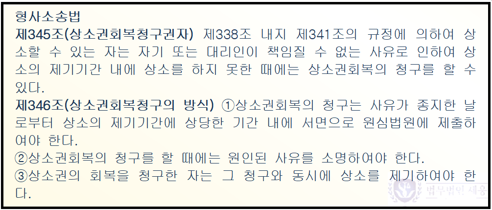 결국 상소권회복청구도 사건번호가 부여되는 하나의 재판이므로 자신의 상황이 상소권회복청구의 대상이 된다는 점에 대해서 관련 판례와 법리를 잘 분석해서 주장·입증해야만 청구가 인용될 수 있는 것입니다.