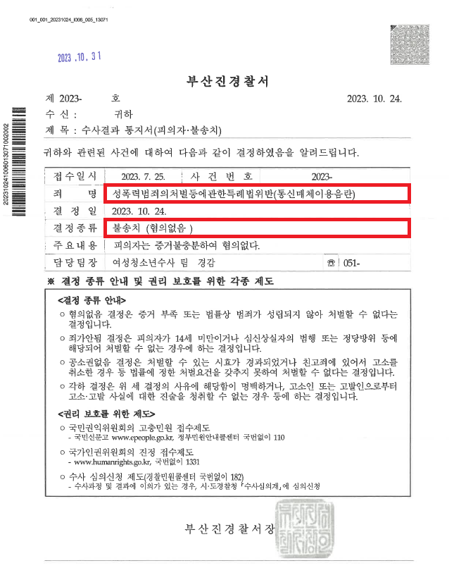 이러한 저의 조력을 바탕으로 A씨는 담당수사관이 혐의가 인정될 것 같다는 말을 하였을 정도로 매우 불리한 상황이었음에도 불구하고 '불송치(혐의없음)' 결정을 받음으로써 섣불리 대응하였다면 얼마든지 될 수 있었던 성범죄자가 될 위기에서 벗어날 수 있었습니다.