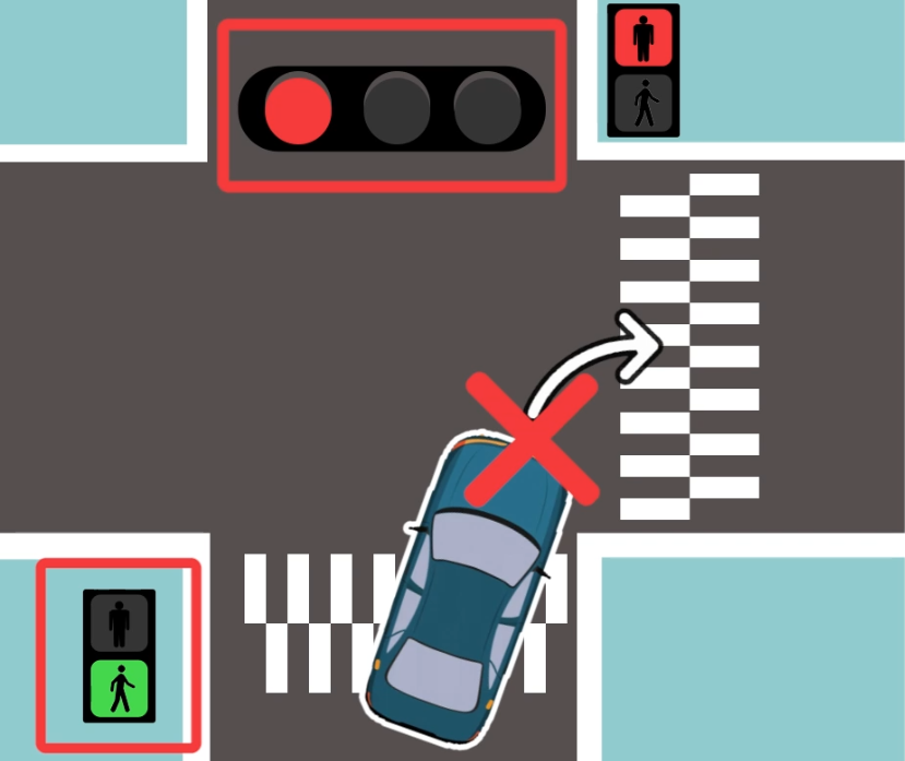 (2) 횡단보도의 보행자 신호가 적색인 경우 (정면에 보이는 차량 신호는 무관)에는 다른 차량의 교통을 방해하지 않고