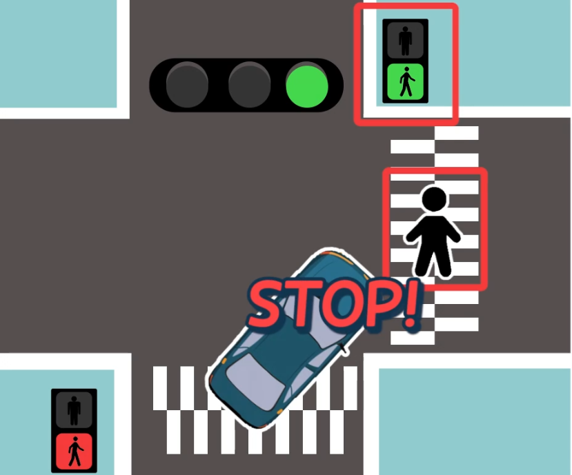 ※ 다만 2022년 1월 11일 개정되어 2022년 7월 12일부터 시행 예정인 개정 도로통법에 따르면 보행자가 횡단보도를 통행하고 있을 때 뿐 아니라, 통행하려고 할 때에도 일시정지를 하여야 합니다. 단, 보행자가 없다면 계속 정지해 있을 필요는 없습니다.