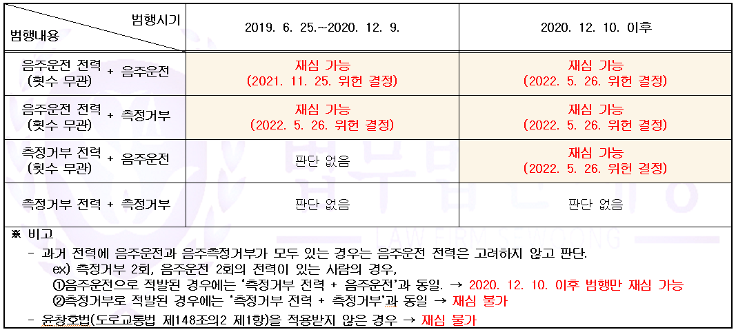 2. 2019. 6. 25.부터 2020. 12. 9. 사이에 음주운전으로 단속된 분들 중 과거에 측정거부 전력이 있는 경우에도 재심 대상이 되지 않습니다.