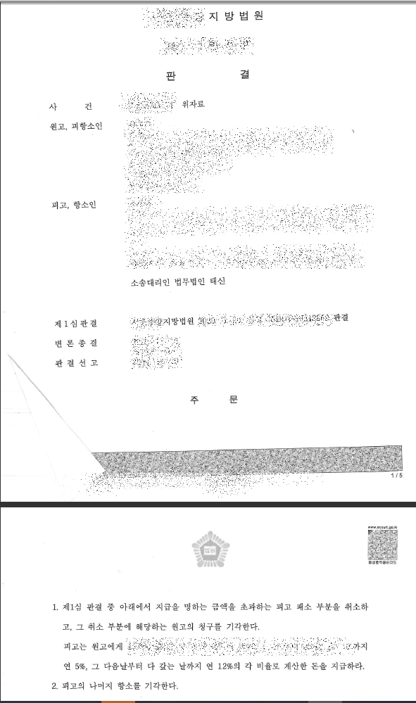 의뢰인은 안일한 생각으로 제1심 재판에서 소극적으로 대응함으로써 비교적 많은 금액의 위자료를 부담해야 하는 상황이 왔었지만, 태신이 항소심에서 적극적이고 적절히 변론을 진행한 결과 제1심에서 책정된 위자료를 대폭 줄일 수 잇었던 사건이었습니다.