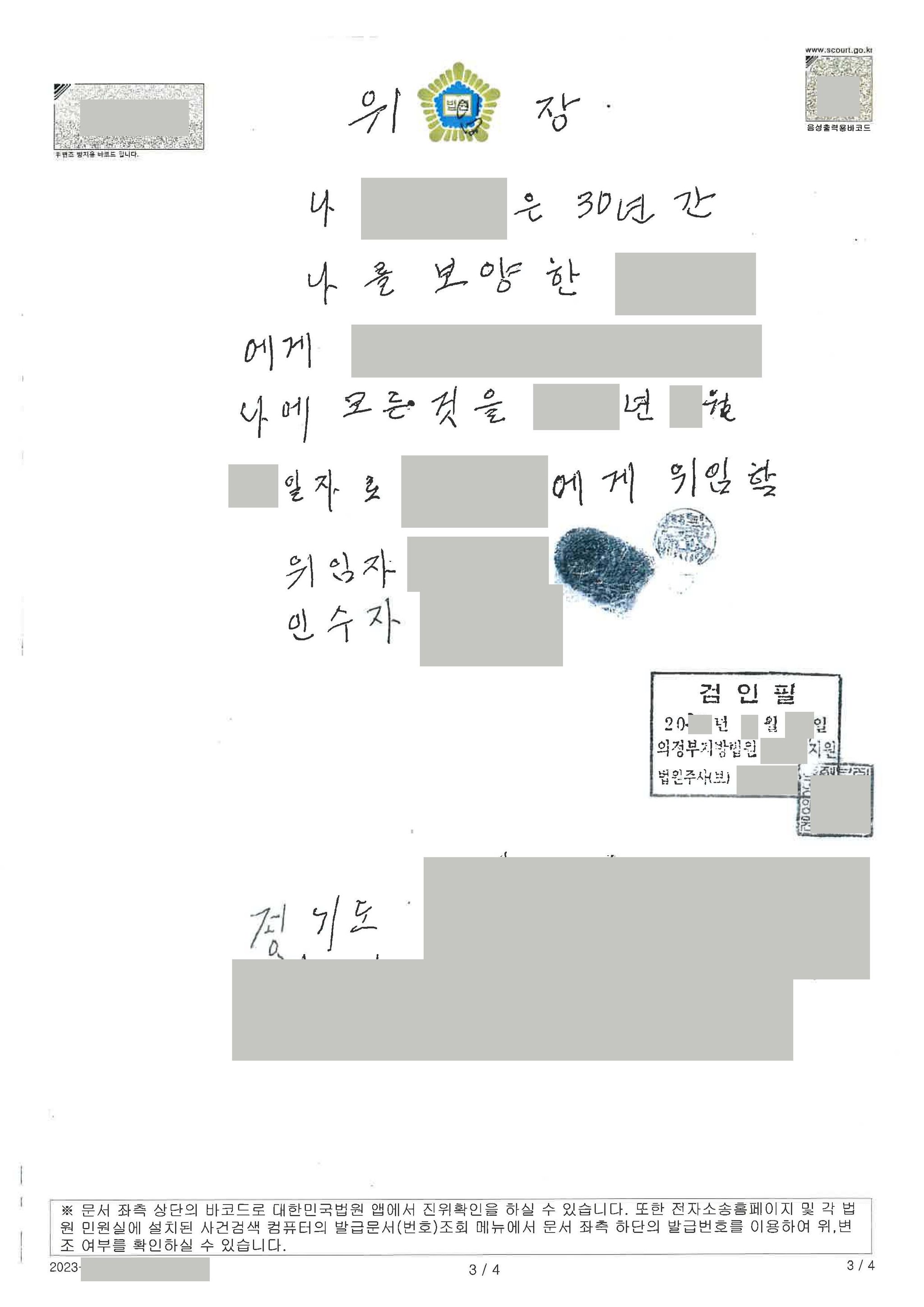 개인정보 문제가 있어 유언 내용 대부분을 가렸는데 이 유언의 내용을 다시 적으면 다음과 같습니다.