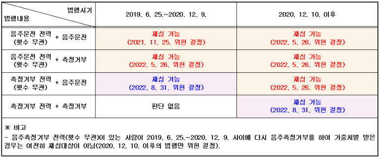 이번 결정(2022. 8. 31.) 이전까지는 '2019. 6. 25.~2020. 12. 9. 사이에 음주운전으로 적발되었으나 과거 음주측정거부 전력이 1회라도 있던 사람'과 '음주측정거부 전력이 1회라도 있던 사람이 다시 음주측정을 거부한 경우'는 재심 대상이 되지 않았습니다.