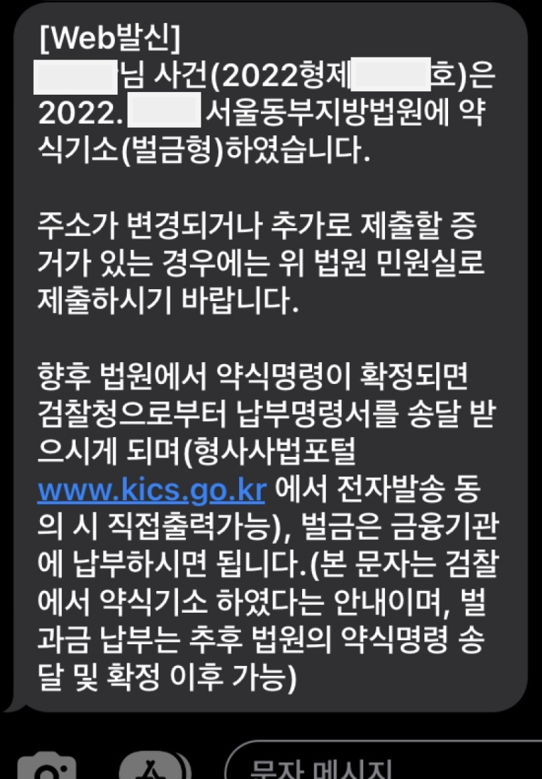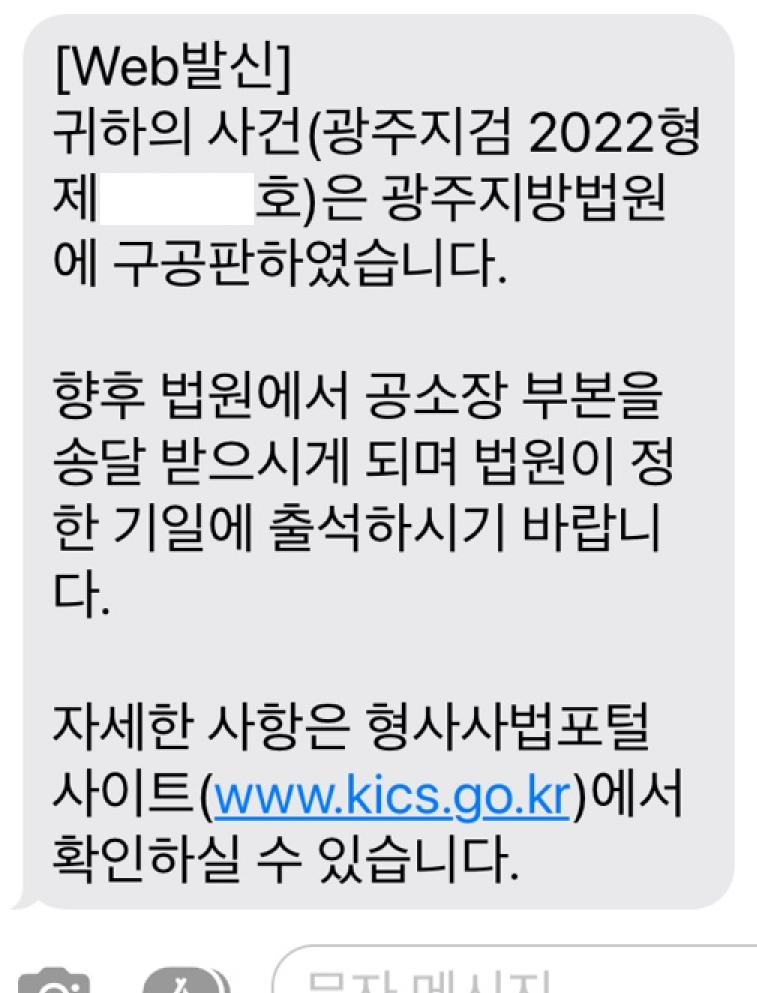 그리고 요즘에는 문자로도 통보를 해줍니다. 그중 경찰에서 검찰로 사건이 넘어간 후 검사의 처분이 있게 되면 받게 되는 문자들 중 "귀하의 사건을 OO법원에 약식기소하였습니다." 또는 "귀하의 사건을 OO법원에 구공판 하였습니다."라는 문자가 있습니다(아래 캡처한 이미지와 같은 문자들입니다).