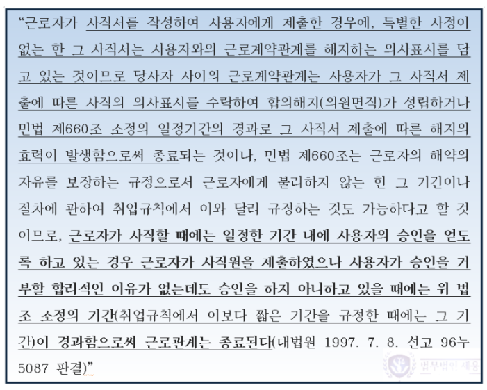 결국 정리하자면 특별한 사정이 없는 한 사직서의 수리 여부와 무관하게, 취업규칙에 사직서 제출일로부터 1개월 이내의 정해진 기간이 경과하면 효력이 발생하는 것으로 되어 있다면 그 기간, 취업규칙에 기간을 정하지 않았거나 1개월 이상의 기간으로 정해진 경우라면 사직서 제출일로부터 1개월이 경과하면 근로계약은 종료된 것이고 더 이상 출근을 할 필요도 없고 정당하게 퇴직금을 수령할 수 있게 되는 것입니다(단, 위에서 말한 대로 예외적으로 3개월이 되는 경우가 있을 수 있음).