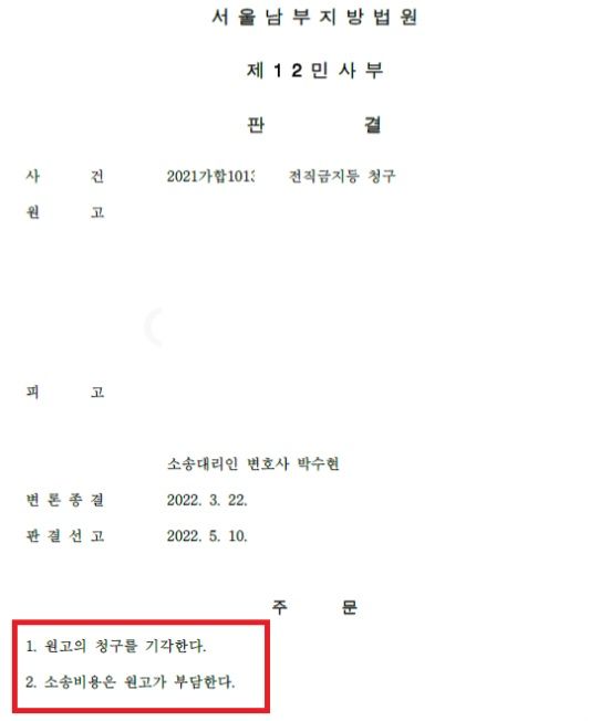 본 변호사는 이 사건 전직금지약정(경업금지약정)은 보호할 가치가 있는 사용자의 이익이 존재하지 않는다는 점 등 주요 쟁점들을 이전 직장에서의 구체적인 사실관계를 들어 주장 입증하였습니다. 이에 법원 역시 피고측 주장을 받아들여 이 사건 원고 회사가 피고와 체결하였던 전직금지약정(경업금지약정)은 무효라고 판단하여 원고 기각 판결을 하였습니다. 이후 원고 회사는 항소를 포기하였으므로 그대로 확정되었습니다. 이로서 피고는 드디어 전 직장으로부터 자유롭게 된 사건입니다.