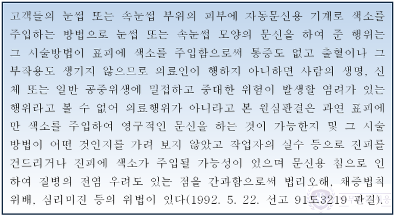 30년 전 대법원에서 눈썹 문신과 같은 반영구 화장 시술 역시 의료행위이므로 비의료인에 의한 시술은 의료법에 위반된다고 판단한 이래 지금에 이르기까지도 그와 같은 판단이 유지되고 있습니다.