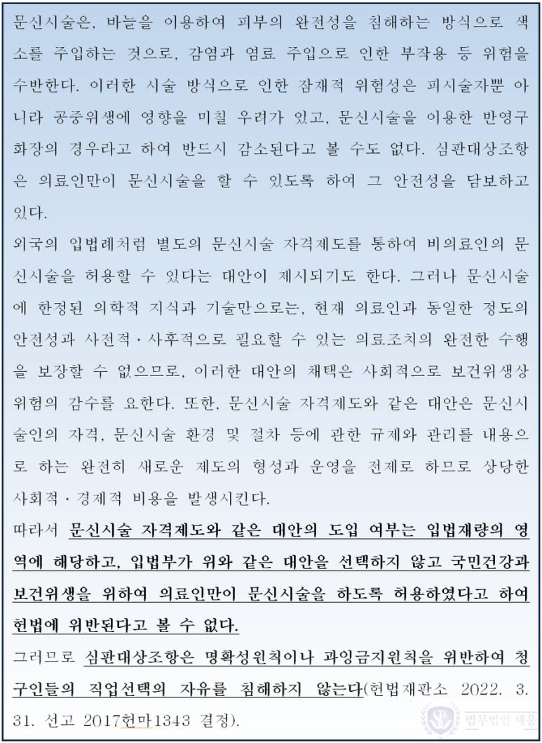 우선 위 헌법재판소 결정에서 재판관 4인은 ①치료목적 행위가 아니고, ②그 시술 방식이 정형화 되어 있으며, ③위험성이 통제될 수 있는 행위이므로 다른 무면허 의료행위와 동일하게 볼 수 없고, 따라서 필요한 시술사의 자격, 위생적인 환경, 도구의 위생관리, 절차, 방법 및 염료에 대한 규제를 바탕으로도 안전한 시술이 가능하다는 점에서 현재의 법률의 위헌이라는 반대 의견을 밝혔습니다.