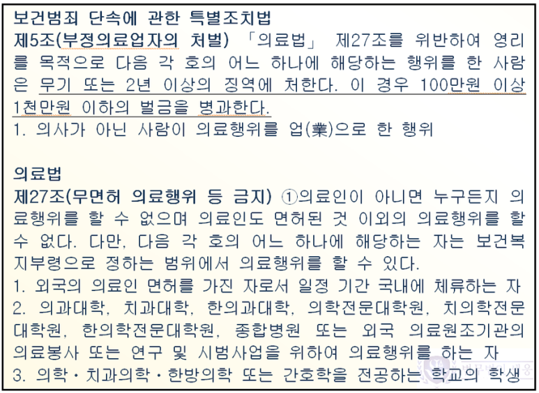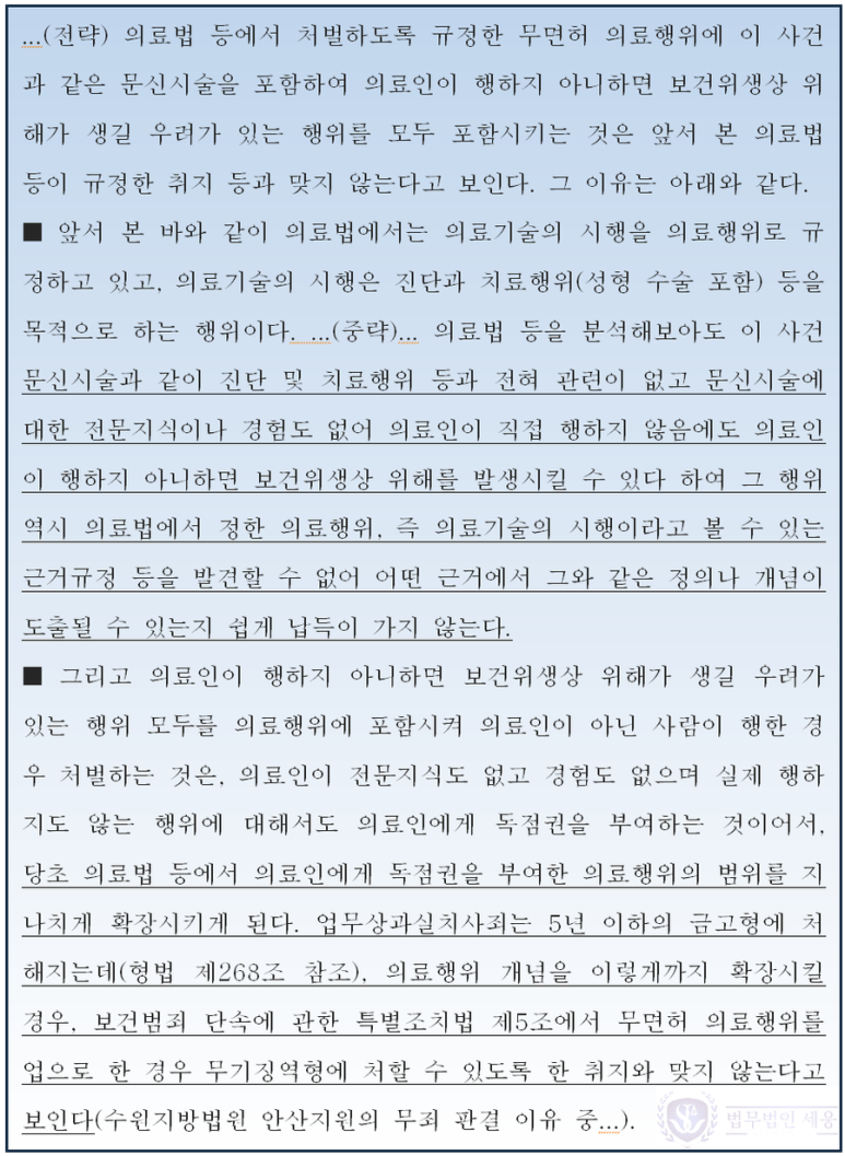 개인적으로는 이를 의료행위로 보아 이와 같이 무거운 처벌을 하는 것이 타당한 것인지에 대해서 의문이 듭니다. 하지만 문제는 법원의 해석이 법리(法理)적으로 완전히 잘못된 것이라고 말하기도 어렵다는 점입니다.