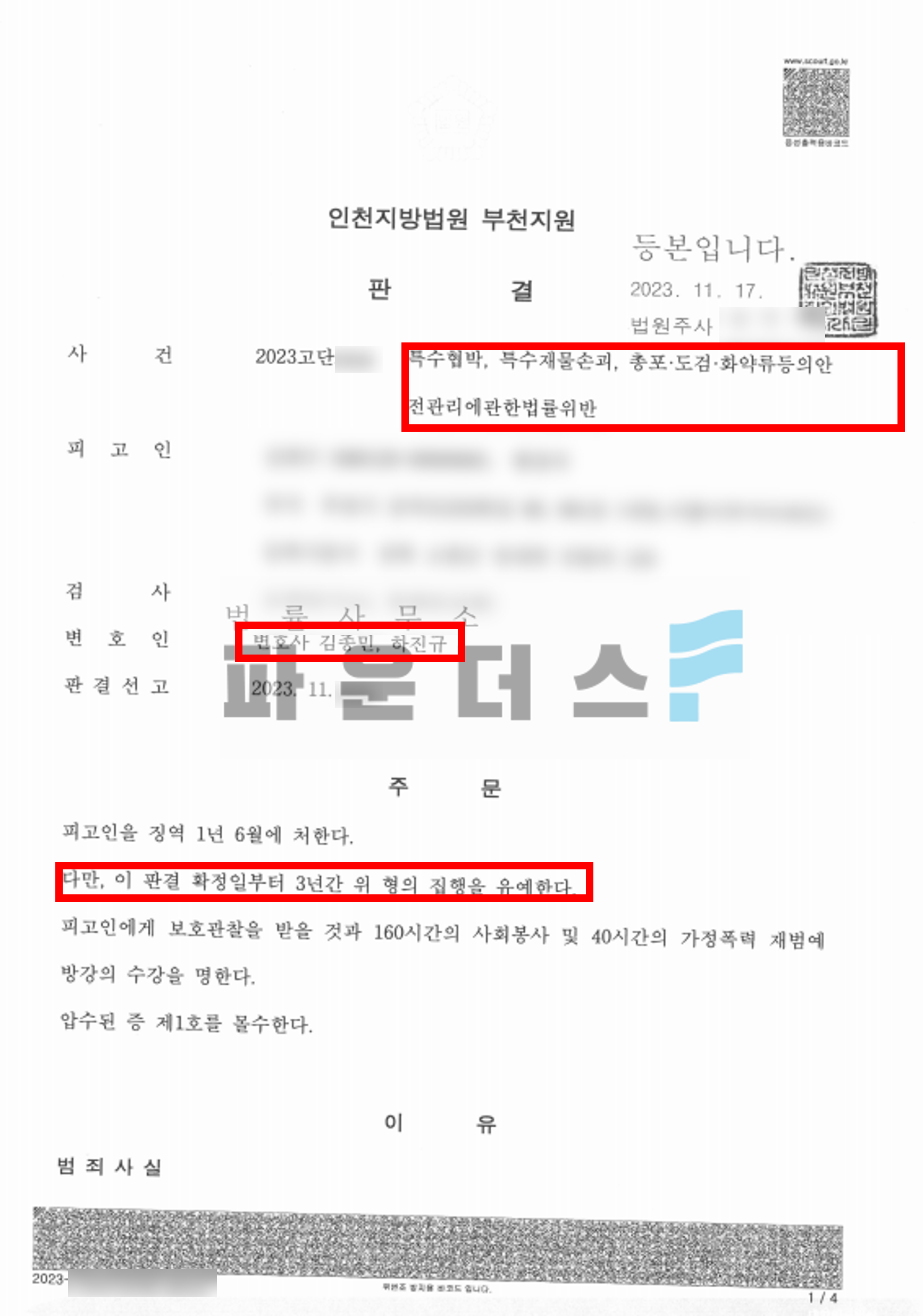 이와 같은 과정의 끝으로 의뢰인은 특수협박 혐의와 특수재물손괴 혐의 그리고 총포ㆍ도검ㆍ화약류등의안전관리에관한법률위반 혐의에 있어 집행유예 처분으로 마무리 지을 수 있었습니다.