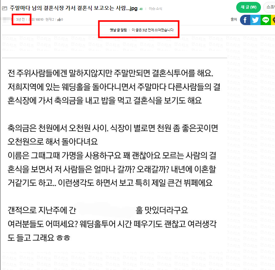 얼마 전 흥미로운, 아니 어이없는 기사를 하나 보게 되었습니다. 한 네티즌이 주말마다 남의 결혼식장에 가서 축의금 1,000원, 5,000원을 내고 뷔페 식사를 하고 온다고 글을 올렸는데 그에 대한 기사가 올라왔더군요.