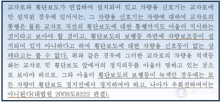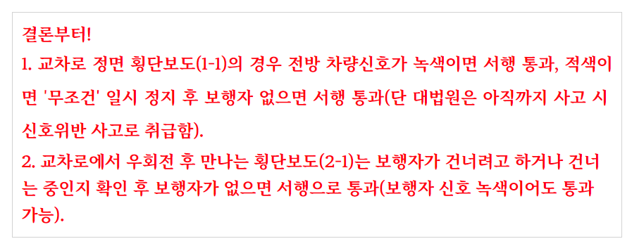 두 번째 문제는, 경찰에서는 원활한 교통 흐름을 위해서 1번 위치에서 전방 1-2신호가 적색인 경우에도 건너거나 건너려는 보행자가 없다면 통과할 수 있다고 하고 있는데요, 관련 대법원 판결을 볼게요.