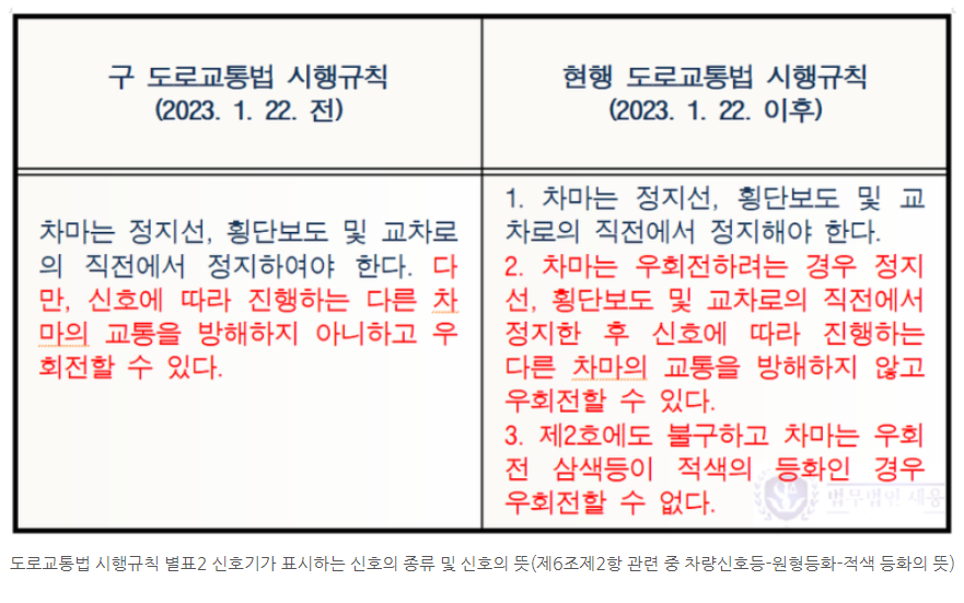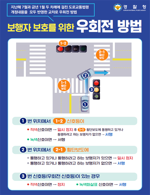 그리고 우회전 신호등이 있으면 우회전 신호등에 따라야 한다는 점도 규정했지요.