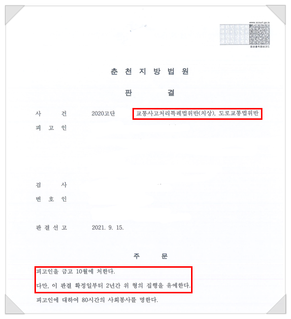 혐의 : 교통사고처리특례법위반(치상), 도로교통법위반