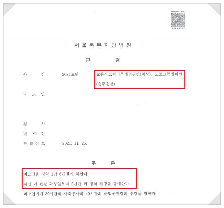 혐의 : 교통사고처리특례법위반(치상), 도로교통법위반(음주운전)