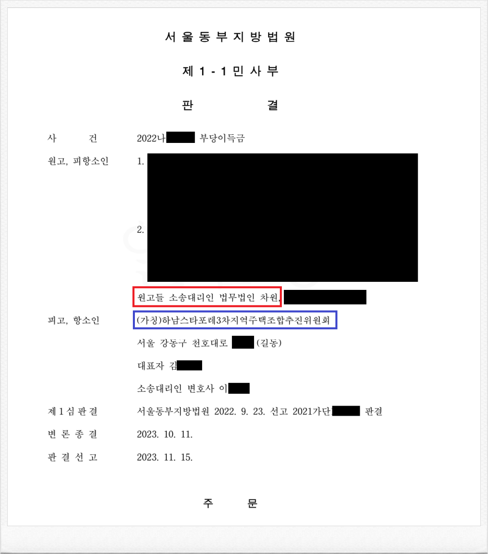 이번에도 재판부는 저의 주장을 받아들여, 제1심에서의 사실인정과 판단은 정당한 것으로 인정됨을 그 이유로 하여, (가칭)하남스타포레3차 지역주택조합 추진위원회 측의 항소를 기각하였습니다.