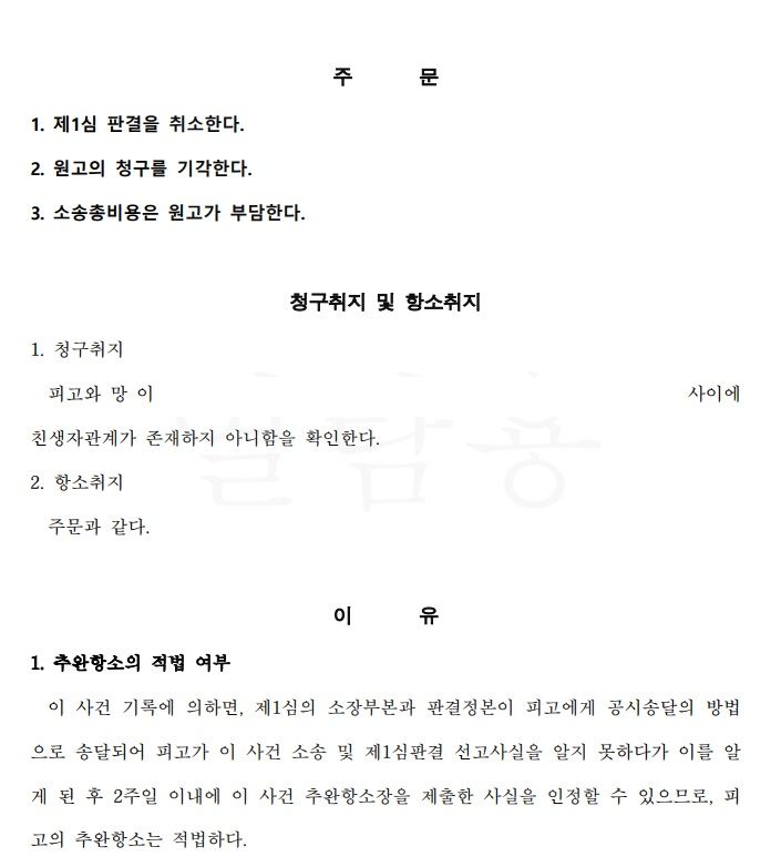 본 변호사는 의뢰인이 제1심 소송과정에서 기한 내에 응소나 변소를 하지 못했던 사정을 정리하여 추완항소이유를 개진하여 항소심 절차가 진행되게끔 이끌어갔고, 이후 항소심 변론절차에서 유전자감정촉탁신청을 통해 의뢰인과 친부는 서로 부녀관계에 있음을 증명하였습니다.