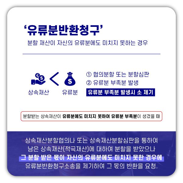 유류분반환청구소송은 피상속인으로부터 재산을 물려받지 못하거나 자신의 유류분보다 더 적은 재산을 물려받게 되는 상속인이 유류분만큼이라도 돌려받기 위하여 제기하는 소송입니다. (즉, 유류분반환청구를 제기하는 상속인의 유류분 부족앤은 반드시 보장되어야 함.