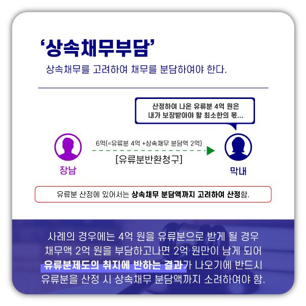 이에 따라 아들은 딸에게 반환하여야 할 유류분으로 합계 6억 원(유류분 4억 원+상속채무 분담액 2억 원)을 산정하게 되는 것입니다.