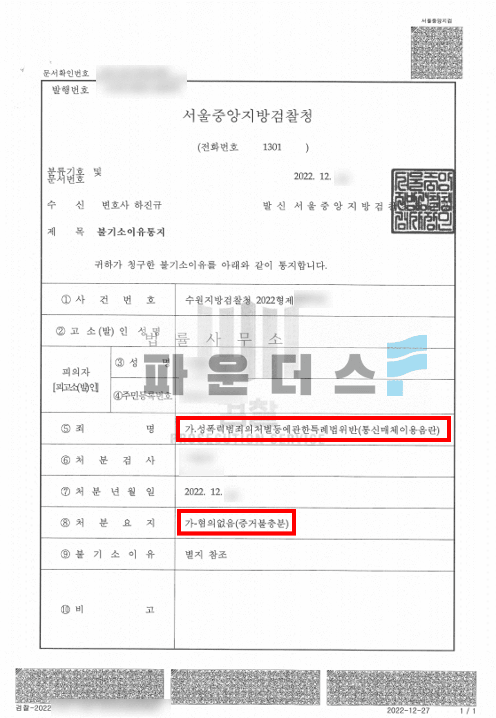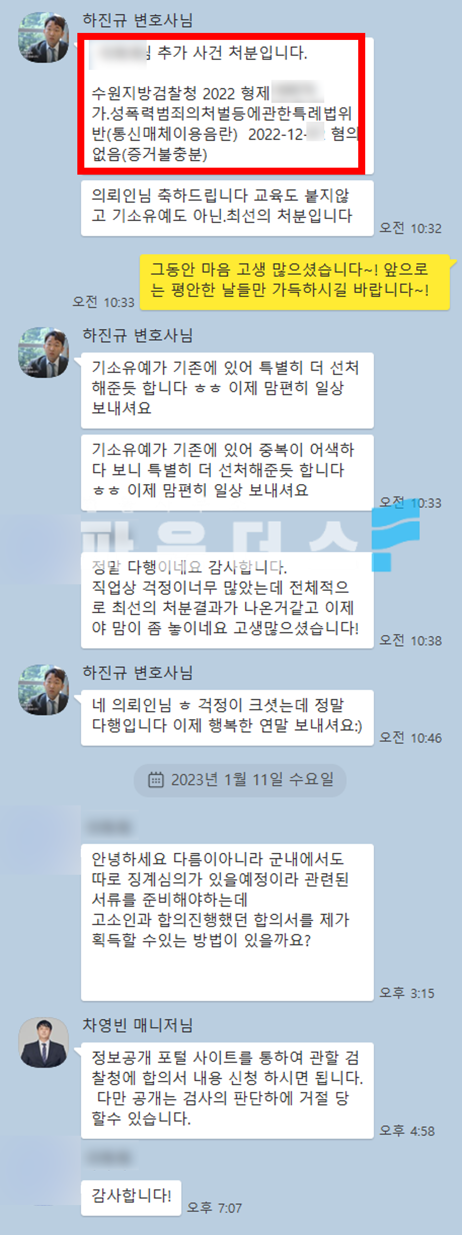 그 결과 의뢰인은 통매음 사건에 있어 혐의없음(증거불충분)으로 마무리 지을 수 있었습니다.