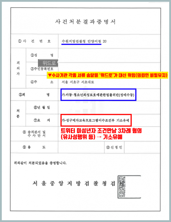 *처분결과 : 아청법위반 기소유예 처분(형사처벌로 인한 각종 불이익 면제)