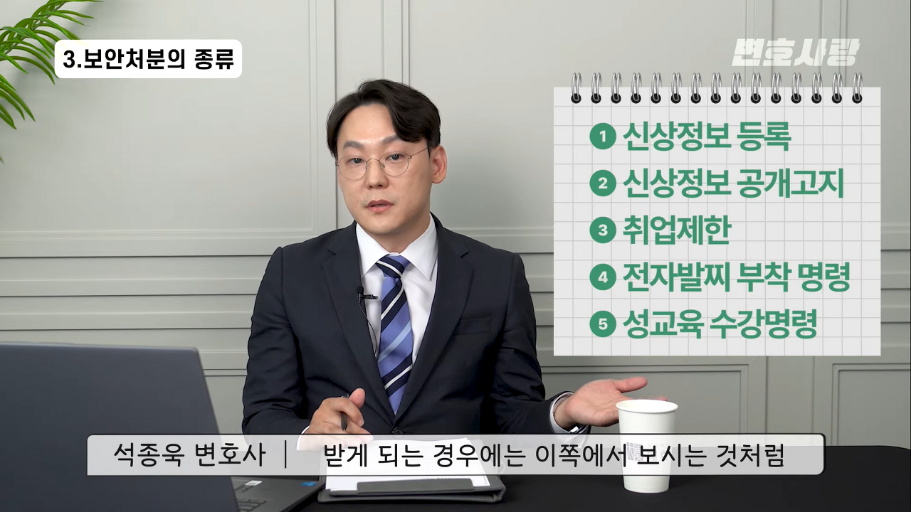 경중마다 다르겠지만 형사처벌을 받는 양이라는 것은 어느 정도 정해져 있기는 합니다. 어떤 성범죄같은 경우는 예를 들면 2, 3년 정도의 형사처벌을 받는 것일 뿐이지만, 그로 인해서 부과되는 보안처분은 신상정보 등록이 10년 동안 이어진다. 또 아니면 전자발찌 부착은 형사처벌보다 훨씬 더 많은 기간 동안 해야 된다라고 하는 처분이 충분히 내려질 수가 있거든요. 그래서 사실은 이러한 보안처분이 어떻게 보면 형사처벌 자체보다 무거워지는 경우가 많기 때문에 반드시 변호인의 조력을 통해서 적정한 수준의 보안 처분이 내려질 수 있도록 하는 것이 중요하다고 생각합니다.