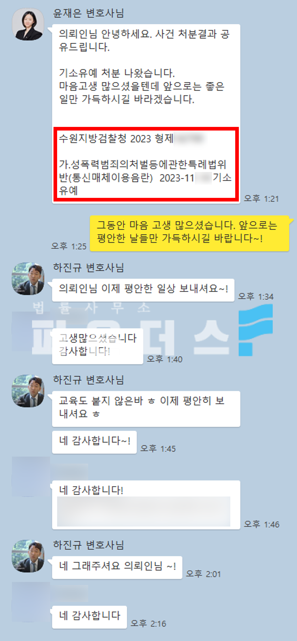 이와 같은 노력 끝에 의뢰인은 통신매체이용음란 혐의에 있어 기소유예 처분으로 사건을 마무리할 수 있었습니다.