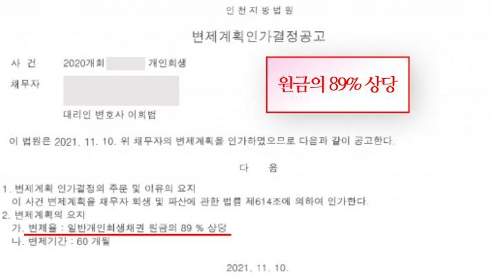 해당 사례의 채무자는 변제기간 60개월에 변제율은 채무 원금의 89% 상당으로 최종적으로 변제계획안이 인가되어 5개월째 성실하게 월 변제액을 납입하고 계십니다. 채무의 꽤 많은 부분이 국민건강보험공단의 우선 채권으로 변제기간의 절반 이내의 기간동안 우선 채권을 먼저 변제하고 나머지 일반 채권을 변제하는 계획안으로 원금 채무액의 89% 상당을 변제하는 조건으로 최종적으로 인가를 받았습니다.
