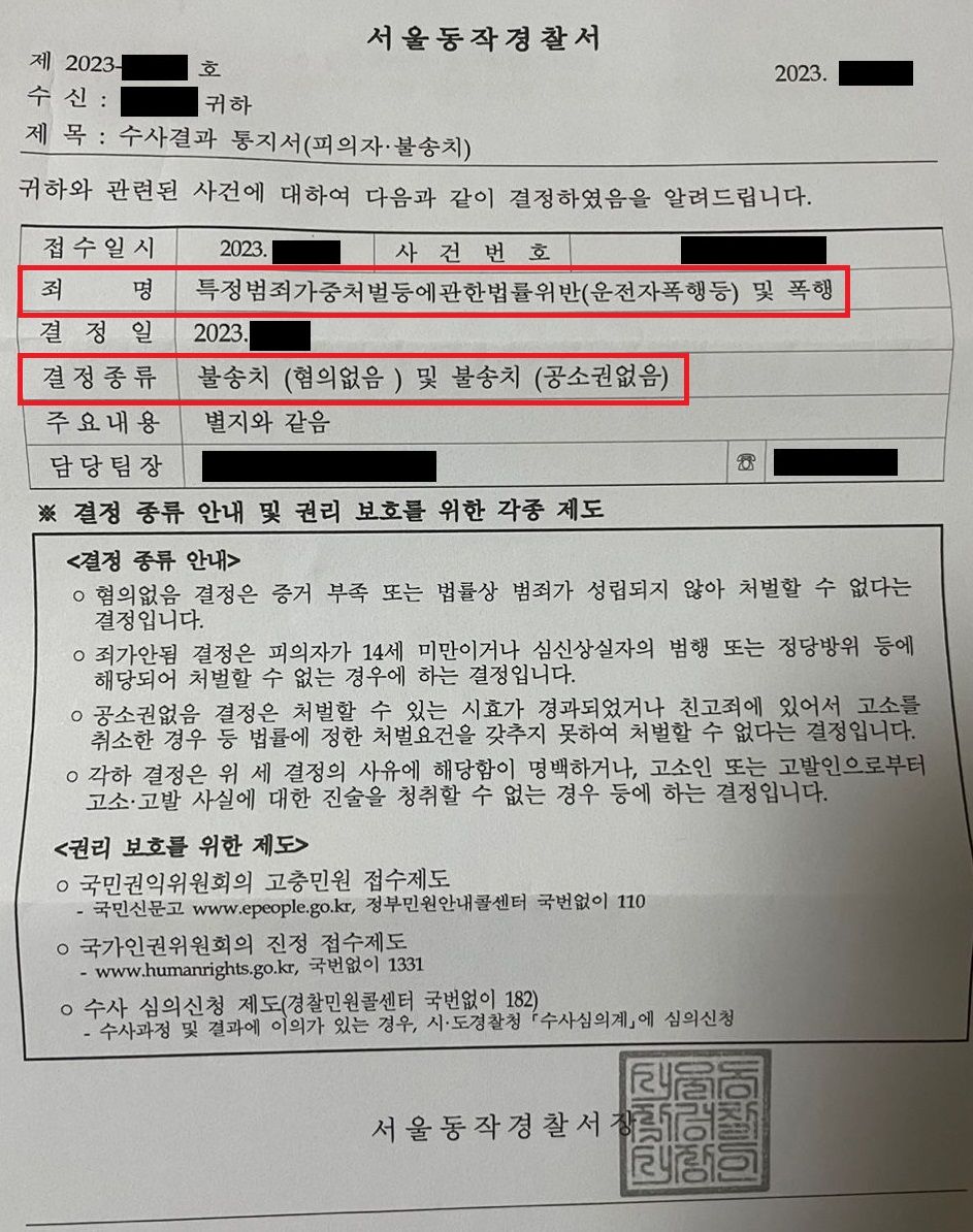 이 사건에서 경찰에서는 운행의 의사가 없다는 점이 인정되어 다행히 일반 폭행으로 의율될 수 있었고, 일반 폭행의 경우 반의사불벌죄이고, 저희는 피해자와 합의를 하였으므로 최종적으로 공소권 없음으로 끝날 수 있었습니다.