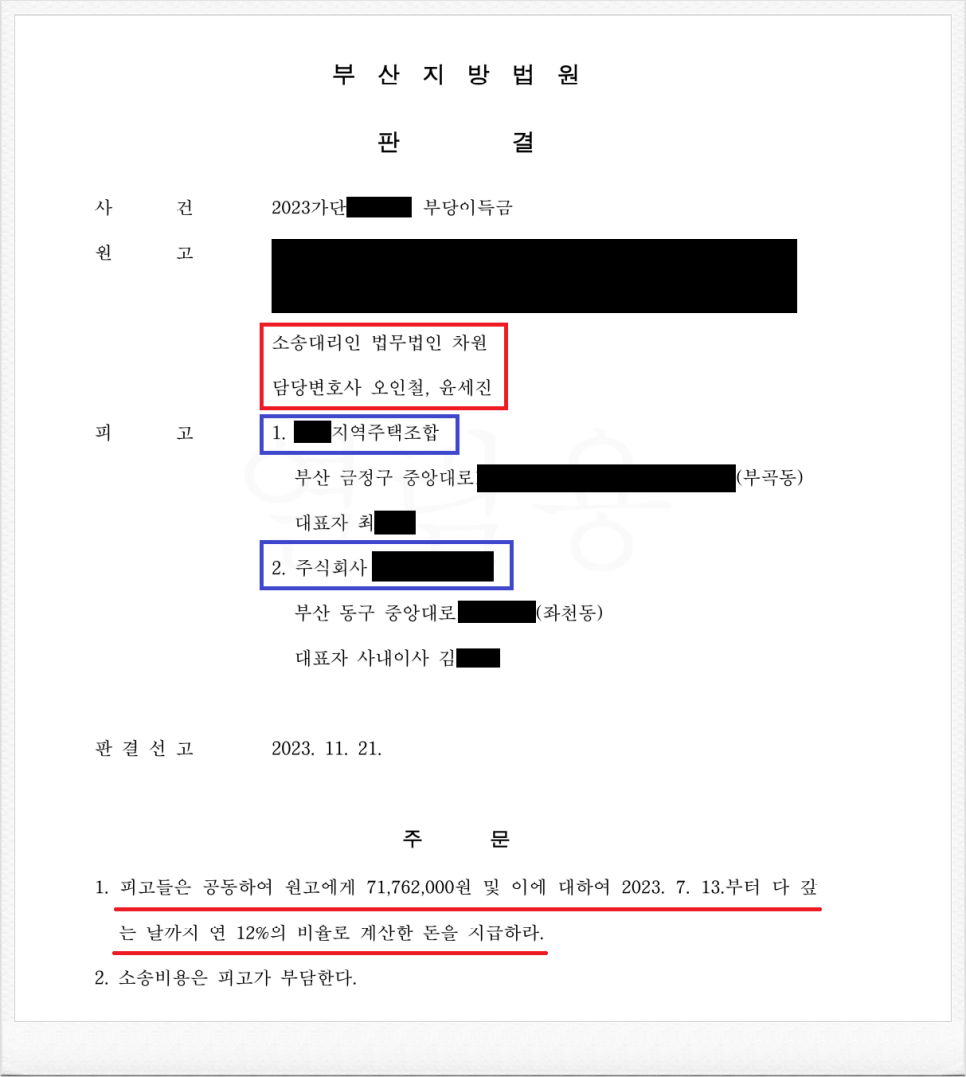 결국, 재판부는 이러한 저의 주장을 받아들였고, 피고 측은 의뢰인에게 기지급 받은 금원 및 이에 대한 지연손해금을 지급하라는 내용의 판결을 이끌어 내었습니다.
