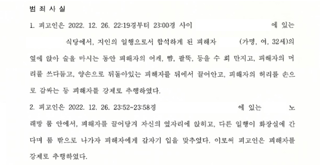 그런데도 A씨는 2022. 12. 26.경 지인들과 술을 마시다가 지인의 일행으로 합석한 여성 B씨를 1, 2차에 걸쳐 계속하여 어깨, 뺨, 팔뚝, 머리, 허리를 수차례 만지고 끌어안고 뽀뽀하는 등 강제추행을 하였고, 이로부터 며칠 뒤 B씨로부터 강제추행 혐의로 고소를 당하였습니다.