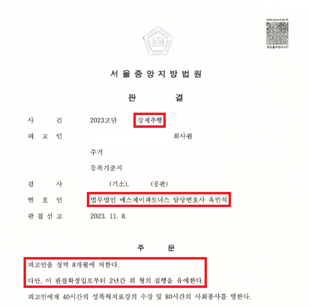 이러한 저의 조력을 바탕으로 A씨는 동종범죄 강제추행치상죄로 집행유예를 선고받은 전력이 있었을 뿐만 아니라 추행 부위와 정도 등이 매우 중하였음에도 불구하고 집행유예를 선고받음으로써 실형이 선고되어 구속될 위기에서 벗어날 수 있었습니다.