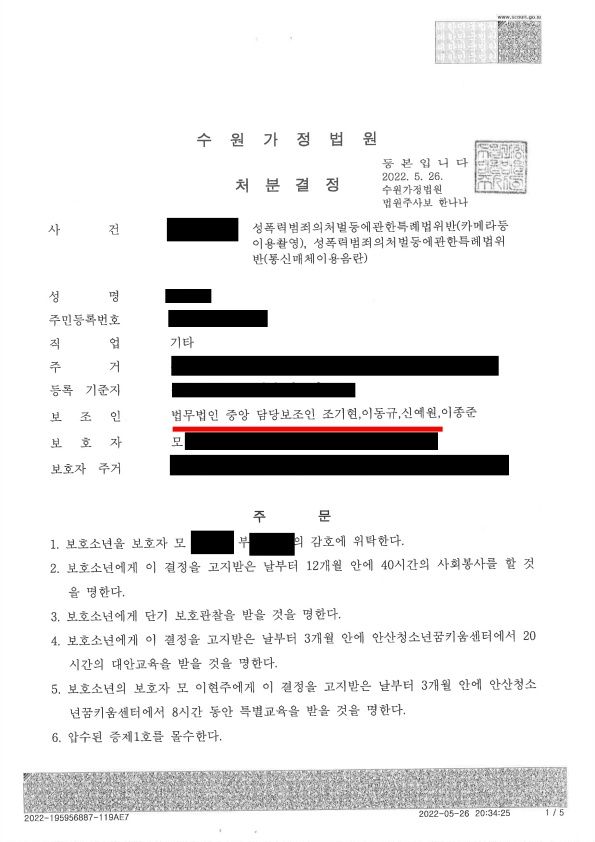 재판부는 이동규변호사의 주장을 받아들여 사건을 소년보호사건으로 송치하였고 의뢰인은 형사처벌을 피하고 종국적으로 보호처분중 1호, 3호, 4호 처분을 받고 사건을 마무리할 수 있었습니다.