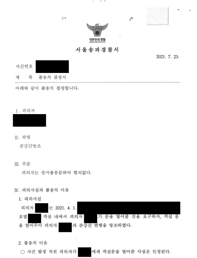 그 결과, 경찰은 사건 발생 전후의 정황에 비추어 피의자의 혐의를 입증할 증거가 확인되지 않는다고 하여 불송치 결정을 하였습니다.
