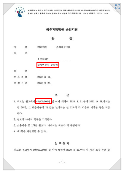 주문 : 피고는 원고에게 40,000,000원 및 이에 대하여 2020. 8. 21.부터 2022. 9. 28.까지는 연 5%의, 그 다음날부터 다 갚는 날까지는 연 12%의 각 비율로 계산한 돈을 지급하라.