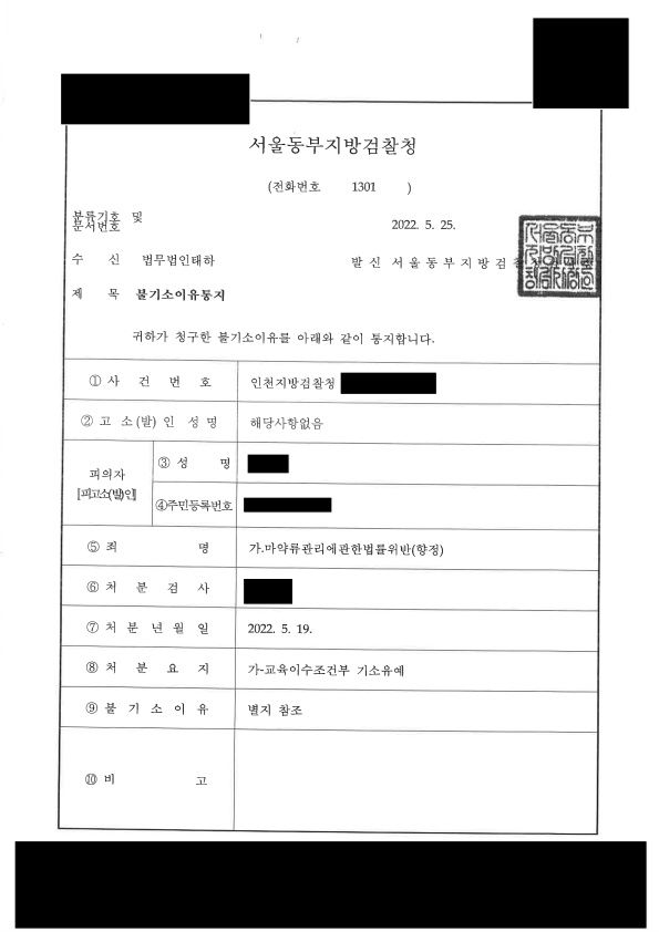 검사는 필로폰의 경우 무거운 범죄라고 경고하면서, 변호인의 주장 및 의뢰인들의 사정을 고려하여 선처해주었고, 마약퇴치운동본부의 교육을 받는 조건으로 기소유예 처분을 하였습니다.