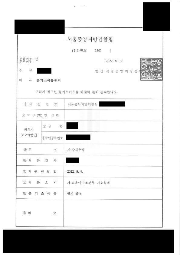 검찰은 담당 변호인의 주장을 받아들여 교육이수조건부 기소유예 처분을 하였습니다.
