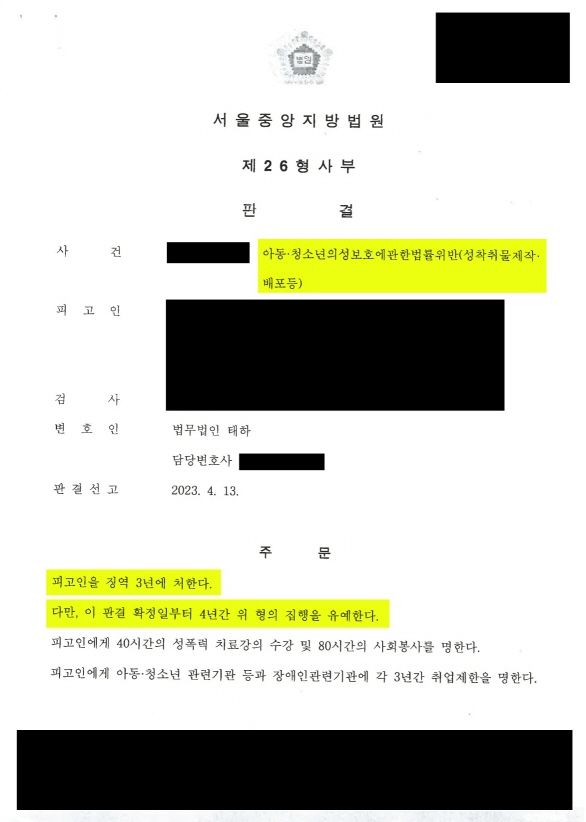 피고인이 게시한 성착취물이 세 개에 불과하기는 하였으나, 이미 ‘세계최강수위방’을 운영하던 이○○이 구속된 상태였으며, 피해자의 신상정보를 알 수 있는 방법이 없어 피해자와 합의를 하는 것 자체가 불가능한 사건이었습니다.