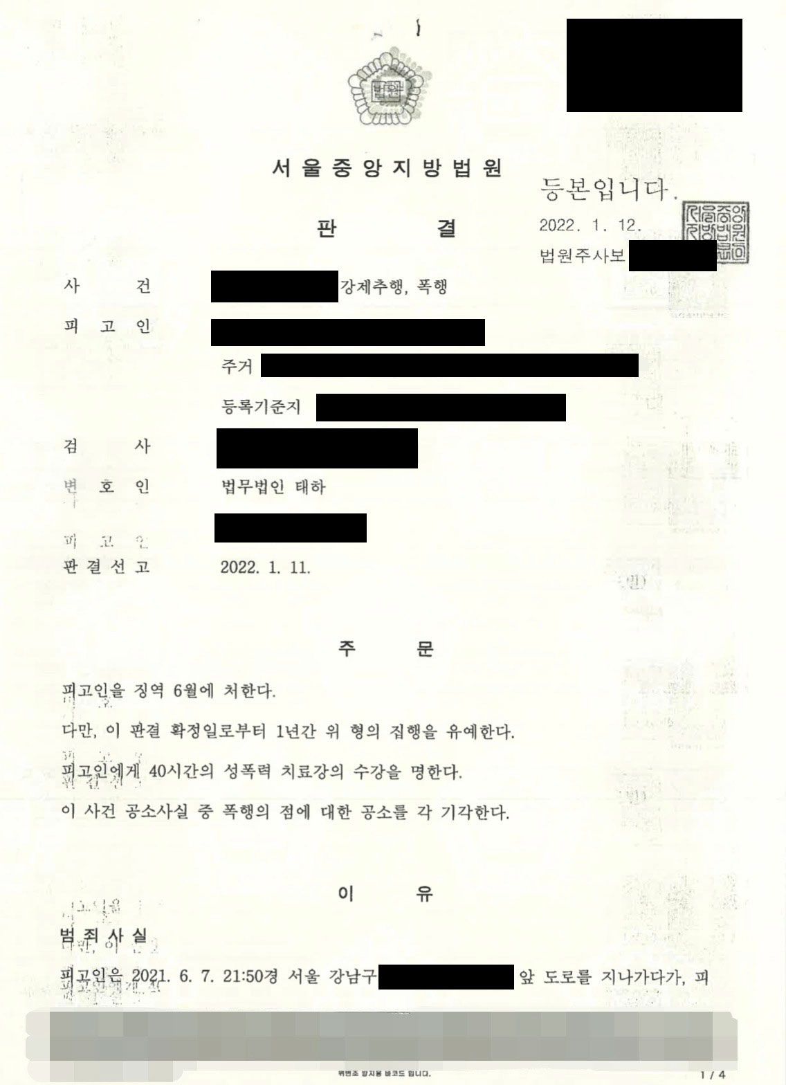 폭행의 점에 대하여는 공소기각을, 강제추행의 점에 대하여는 집행유예 판결을 선고 받았습니다.