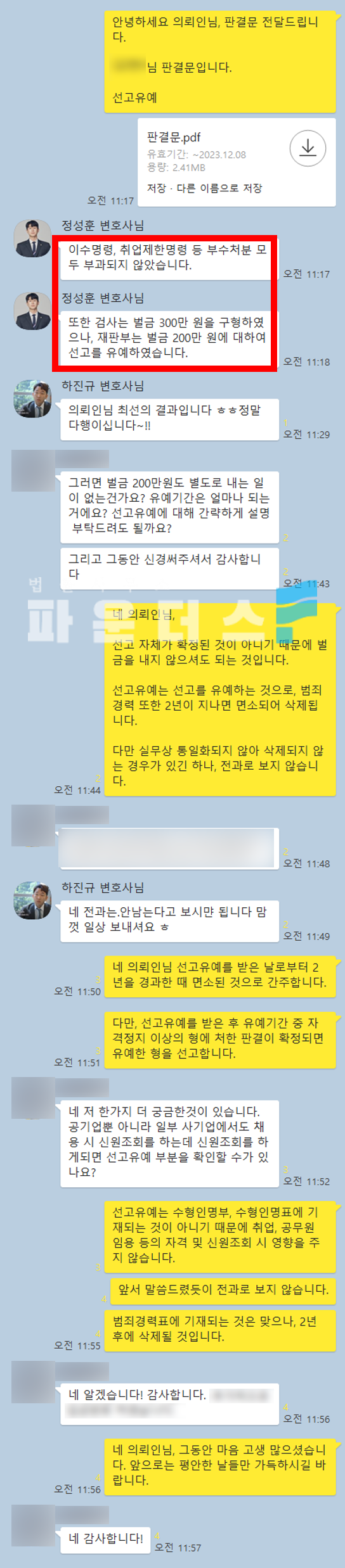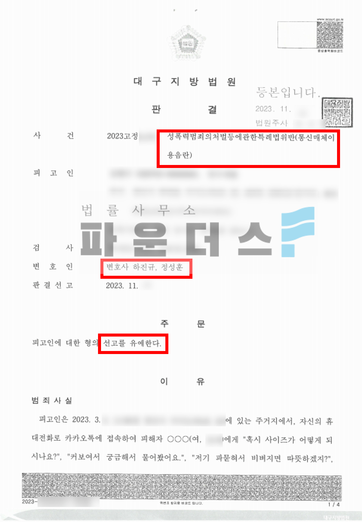 그 결과 의뢰인은 통매음 혐의에 있어 약식기소를 받은 이후 정신재판청구 과정을 거쳐 선고유예를 받아 사건을 마무리할 수 있었습니다.