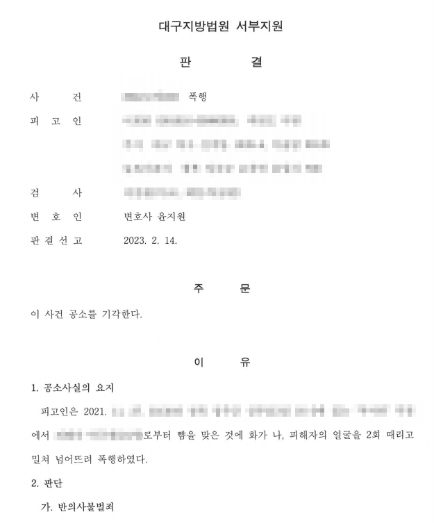 폭행죄는 반의사불벌죄(형법 제260조 제3항)이므로 피해자가 법원에 합의서를 제출할 경우 공소기각 판결이 선고됩니다(형사소송법 제327조 제 6호). 피고인은 피해자와 합의하여 피해자 명의의 합의서에 본인서명사실확인서를 첨부하여 재판부에 제출하였습니다.