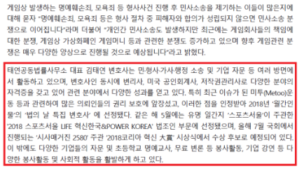 저희 태연법률사무소는 김태연 대표변호사님께서는 사이버 범죄나 사이버 소송에 이어 게임소송변호사, 게임전문변호사 라고도 불리고 있습니다. 특히 저희 태연법률사무소의 김태연 대표변호사님께서는 트렌디한 감각으로 게임 업계에 대해 뛰어난 이해도와 전문성을 보유하고 계시기 때문에 많은 언론사에서도 게임 관련 소송 분쟁에 관하여 먼저 인터뷰를 요청을 주실 정도로 인정받고 있는 실력있는 미녀 변호사님입니다. 항상 시간을 쪼개서 바쁘신 일정을 소화하시지만 게임 내 분쟁으로 인하여 피해를 받고 계신 분들에게 도움을 드리고자 인터뷰를 진행하고 계시니 아래 인터뷰 내용을 참고해주시기 바랍니다.