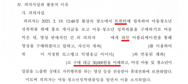 경찰공무원 시험 준비생 A씨는 2023. 2. 19. 12:48경 트위터에서 B씨가 성착취물을 판매한다는 광고글을 보고 라인으로 구매 의사를 밝힌 뒤 30,000원을 이체하고 여성이 자위행위를 하는 동영상 1개를 전송받았습니다.