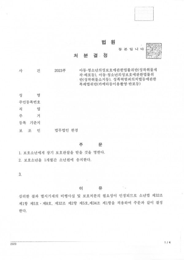 최종결과는 1개월 소년보호 처분을 받았습니다.